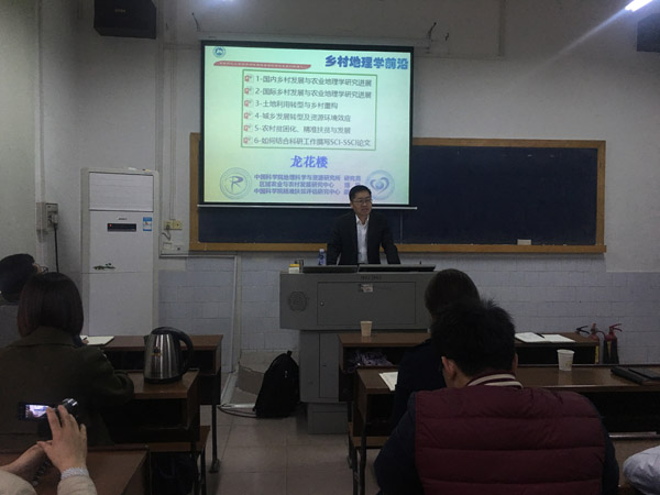 龙花楼研究员系统介绍了国内外乡村地理学研究进展及前沿,重点讲述了国际上农业与乡村发展研究的新理论、新方法与新动态;并围绕土地利用转型与乡村重构、城乡转型发展及其资源环境效应、农村贫困化与精准扶贫、如何撰写乡村地理学领域的SCI/SSCI论文等内容进行了深入讲解。在授课过程中,龙花楼研究员与我校师生就乡村土地利用、乡村转型发展与振兴、学术论文写作等相关问题进行了互动交流,课堂气氛非常活跃,大家深受启发,受益良多。