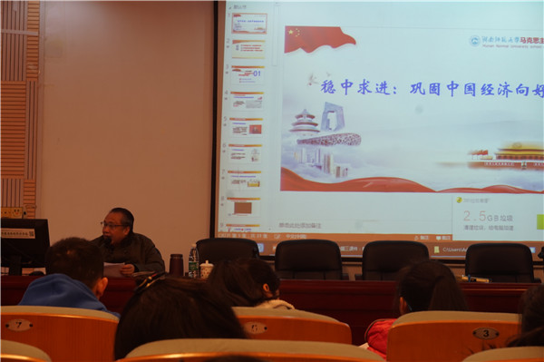 欧阳峣对中国经济从三方面为学生进行了详细解读。一是对我国经济发展基本形势进行了准确的阐述,增速换档下行,态势仍稳中向好。透过国外经济学家对中国经济规律的研究和质疑,他对中国与其它国家经济的不同之处以及速度换挡进入新常态的原因进行了讲解和深入分析。二是重点讲解了供给侧结构性改革引领新常态。由一个有趣的短视频生动形象地说明了供给侧是“上上策”的原因和具体操作。供给侧结构性改革重点在于扎实有效去产能、因城施策去库存、积极稳妥去杠杆、多措并举降成本和精准加力补短板。三是阐述了中国不会落入所谓“中等收入陷阱”,阐述了五个应对“中等收入陷阱”的适用于中国的新模式新优势,分别是科技创新、城乡区域发展新战略、绿色低碳发展、更高水平的对外开放和经济发展成果共享。