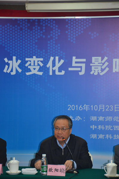 10月23日上午8:30,“雪冰变化与影响”学术研讨会在枫林宾馆开幕。全国有关高校和科研院所的专家学者近百人与会,湖南师范大学副校长欧阳峣教授到会祝贺。