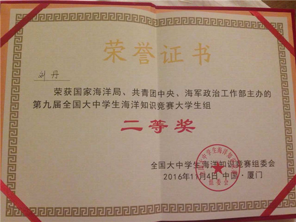 本次大赛经网络答题和各省、区比赛选拔。全国共有中国海洋大学、河海大学、浙江大学、同济大学、厦门大学、中国地质大学和河南师范学院等30多所高校成功进入电视总决赛,刘丹同学在比赛中不畏挑战,顽强拼博,成功闯入电视总决赛并荣获二等奖。