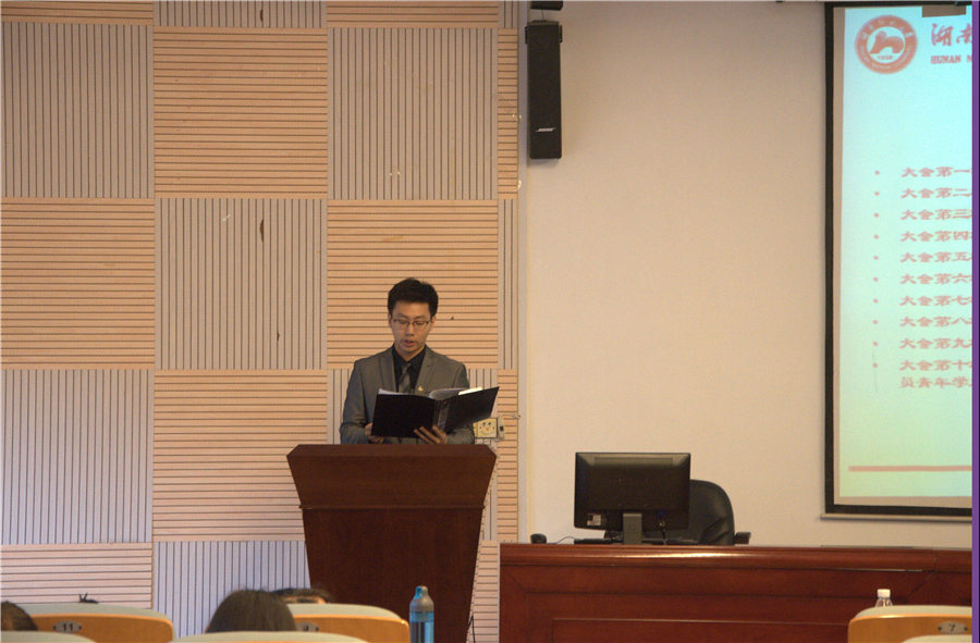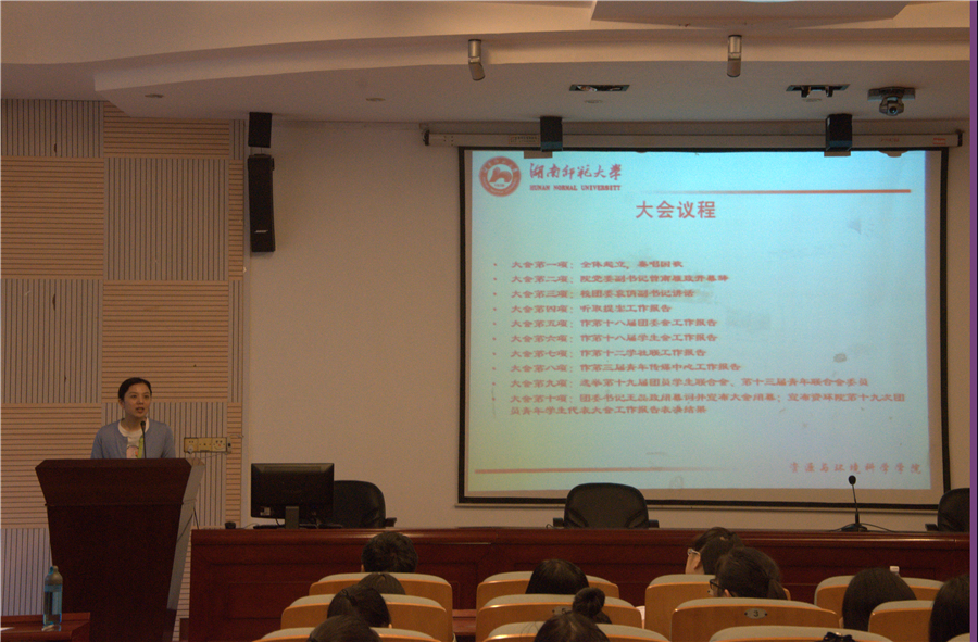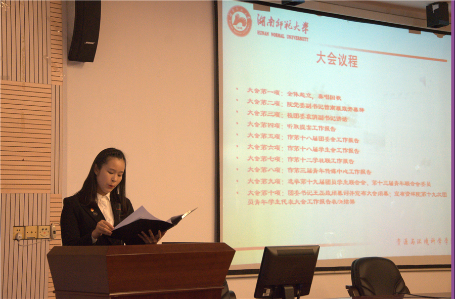 杨惠君宣布大会开始并要求全体起立合唱中华人民共和国国歌。接着,学院团委副书记朱琦至、王圆分别作2015-2016学年度团委工作总结报告并浅谈了工作感受,院学生会主席齐麟、院学社联主席高雅、院青传主任罗俐敏分别作了2015-2016学年度有关部门工作报告,同时也对新一届主席团提出了殷切的希望。随后,朱琦至宣布第十九届团学联合会、第十三届青年联合会换届竞职演讲开始,新一届68位候选人在台上展示了自己的特色,也提出了自己当选后要对部门的规划等等问题。最后,院团委书记王磊作总结讲话。他首先对上一届主席团给予了充分的肯定,并对候选人表示诚挚的祝贺,希望他们能本着“服务同学,奉献自身”的宗旨,怀着强烈的责任心踏踏实实地开展工作,把工作推向新的高度。