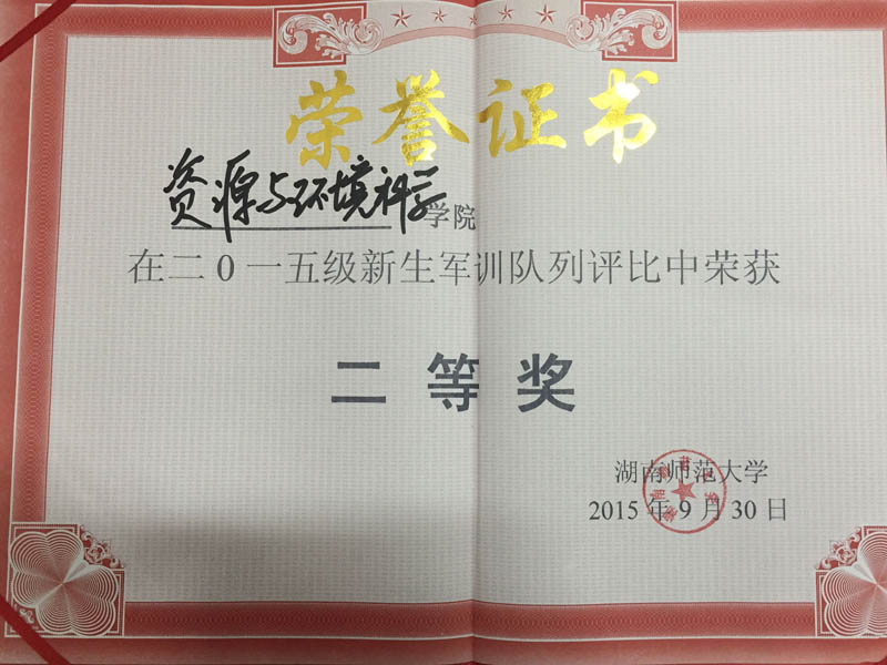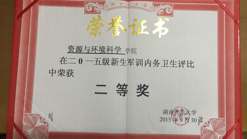 9月30日上午,15级新生军训阅兵仪式暨表彰大会在师大田径场进行,虽然天公并不作美,一直下雨,但资环院新生用她们整齐的动作、昂扬的斗志和嘹亮的口号为军训画上了圆满的句号。获得了“2015级新生军训队列评比”二等奖,“2015级军训内务卫生评比”二等奖,优秀辅导员奖项。