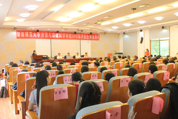 6月18日,资源与环境科学学院在学院301学术报告厅举行毕业典礼欢送2019届毕业生。出席此次典礼的领导嘉宾有学院党委书记彭才华老师、副院长周国华教授、谭长银教授、胡雪松老师以及全体系主任、2015级班导师、学工办老师等。典礼仪式由学院党委副书记陈媛主持。