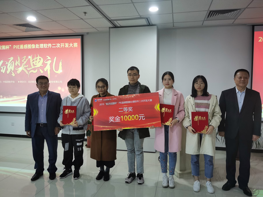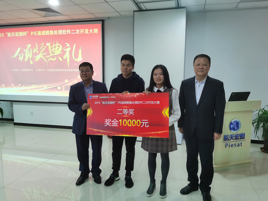 中国测绘学会宋超智理事长为获奖团队颁发了证书,航天宏图董事长王宇翔为获奖团队颁发奖金。