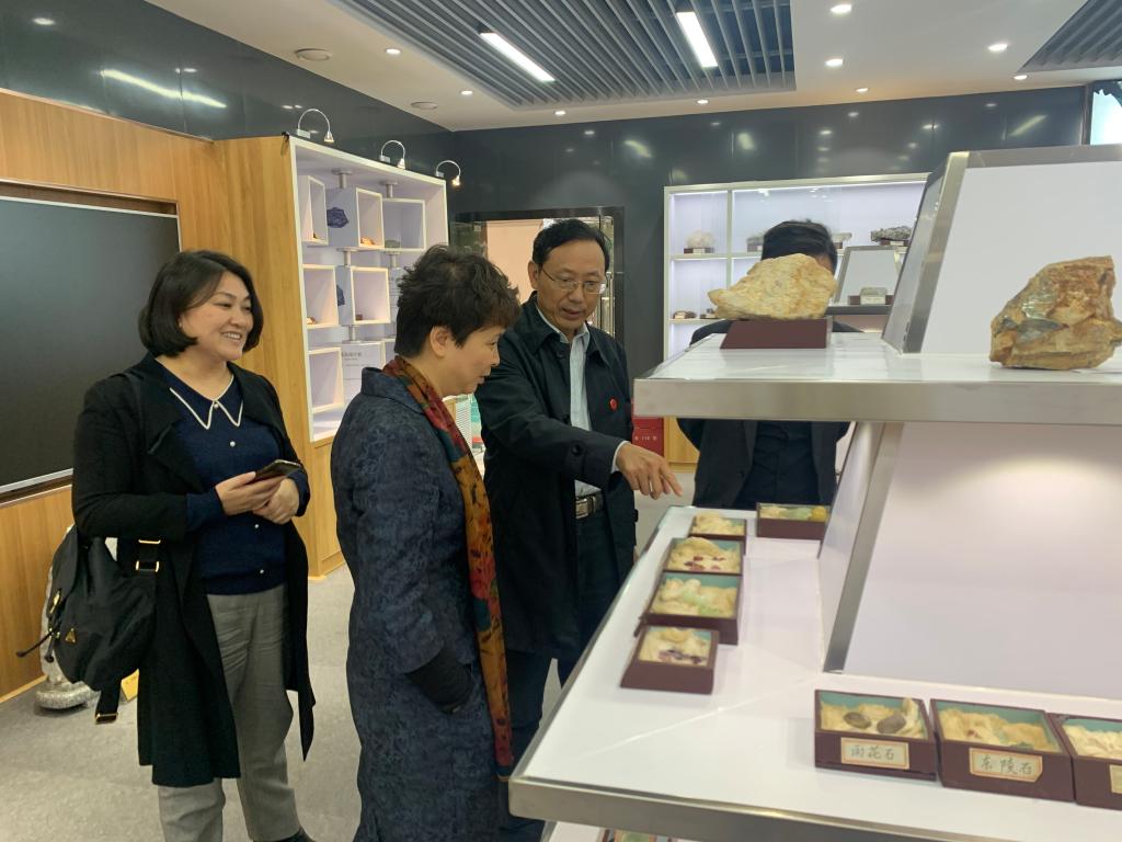 唐文红看到曾经学习使用过的实验仪器和矿物标本(展品)倍感亲切,勾起了大学生活的美好回忆,表示感恩母校、感谢老师的精心培养,称赞地学博物馆的建设意义重大,给校友带来更多幸福感、获得感和归属感。表示回深圳后也要把自己的学校建设得更好,为学生创造更好学习生活环境。