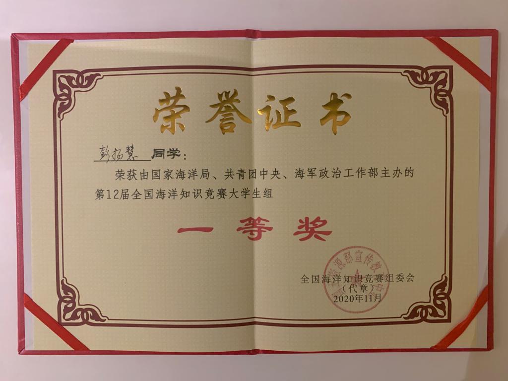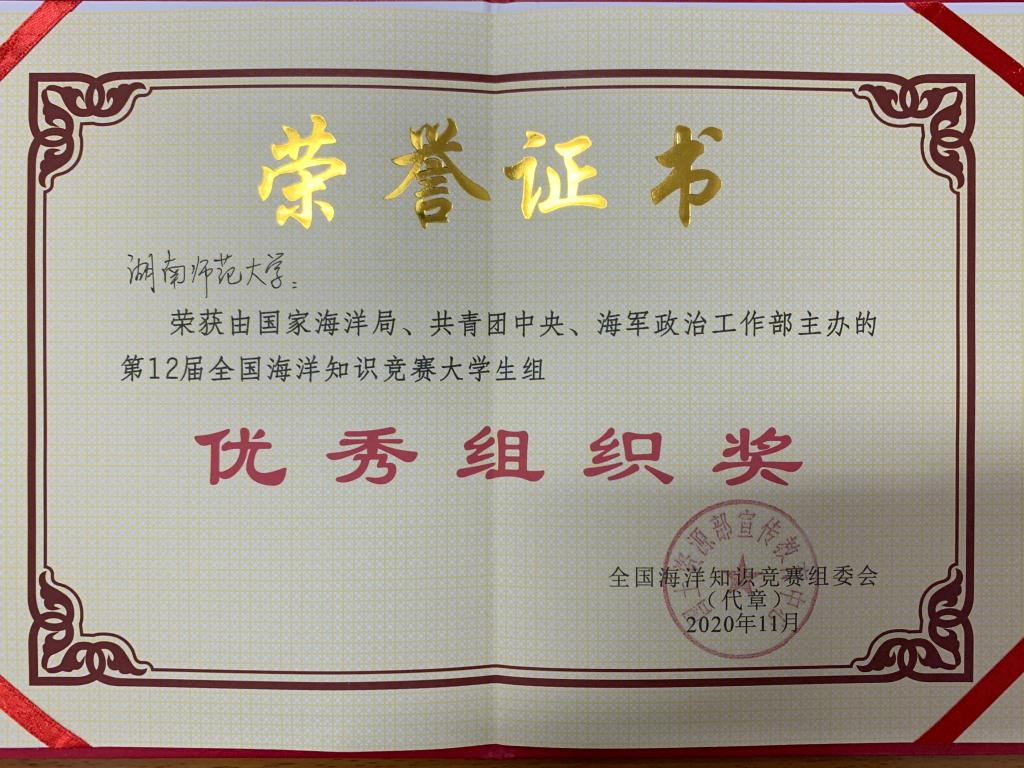 (通讯员 杨惠君 彭扬慧 )11月22日至11月24日,由国家海洋局、共青团中央、海军政治工作部主办,自然资源部宣传教育中心、海洋出版社有限公司、国家海洋局极地考察办公室、中国大洋事务管理局、海南广播电视总台承办的第12届全国海洋知识竞赛大学生组总决赛在海南省海口市举行。365官网2018地理科学专业彭扬慧同学获全国一等奖,我校获“优秀组织奖”。