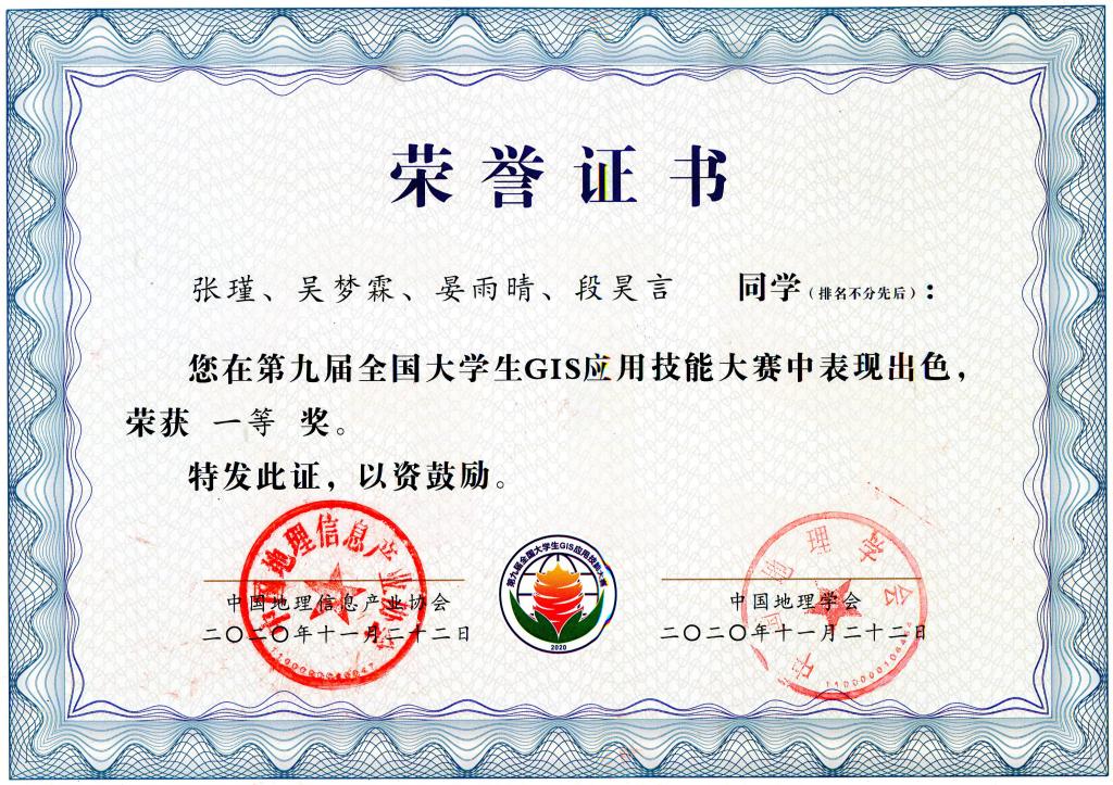 2020年11月20日至22日,“第九届全国大学生GIS应用技能大赛”暨地理学科建设与人才培养高峰论坛在华中师范大学成功举行。由365官网学子张瑾、吴梦霖、晏雨晴、段昊言四位同学组成的湖南师范大学代表队荣获全国一等奖,周亮、万义良老师荣获“一等奖优秀指导教师”称号。