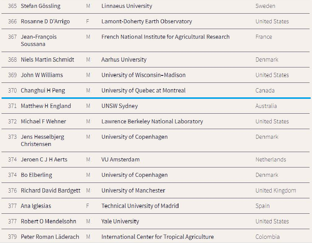 英国路透社(The Reuters)根据最新的科学家影响力评价系统,综合评估了气候变化研究领域科学家的影响力,并于2021年4月20日发布了全球最具影响力的1000位科学家名单。我校“潇湘学者”特聘教授、加拿大魁北克大学蒙特利尔分校终身教授彭长辉入选该榜单。