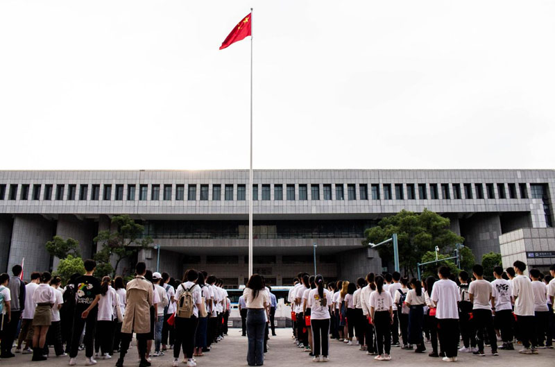 仪式于7:00正式开始。英姿飒爽的女子国旗护卫队踏着铿锵有力的步伐,护送国旗走向升旗台,在全体师生庄严的注目礼中,五星红旗冉冉升起,全体师生共唱国歌。