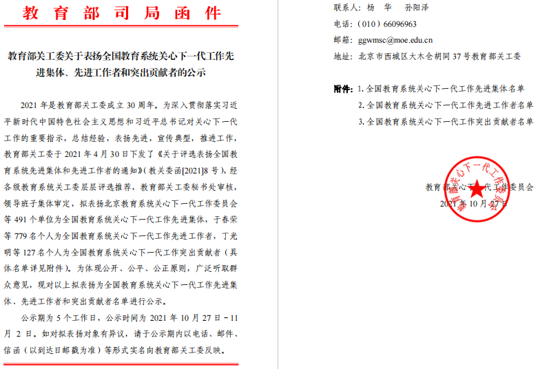 (通讯员 陈胜冲)在教育部关工委成立 30 周年之际,为深入贯彻落实习近平新时代中国特色社会主义思想和习近平总书记对关心下一代工作的重要指示,总结经验,表扬先进,宣传典型,推进工作,教育部关工委近日在全国范围评选表彰了491个先进集体、779名先进个人、127名突出贡献者。365官网关工委经学校、湖南省教育厅关心下一代委员会评定并推荐,成功获评“全国教育系统关心下一代工作先进集体”,这是365官网关工委在教育部关工委组织的各项工作评比竞赛中连续第三年获得的奖项。