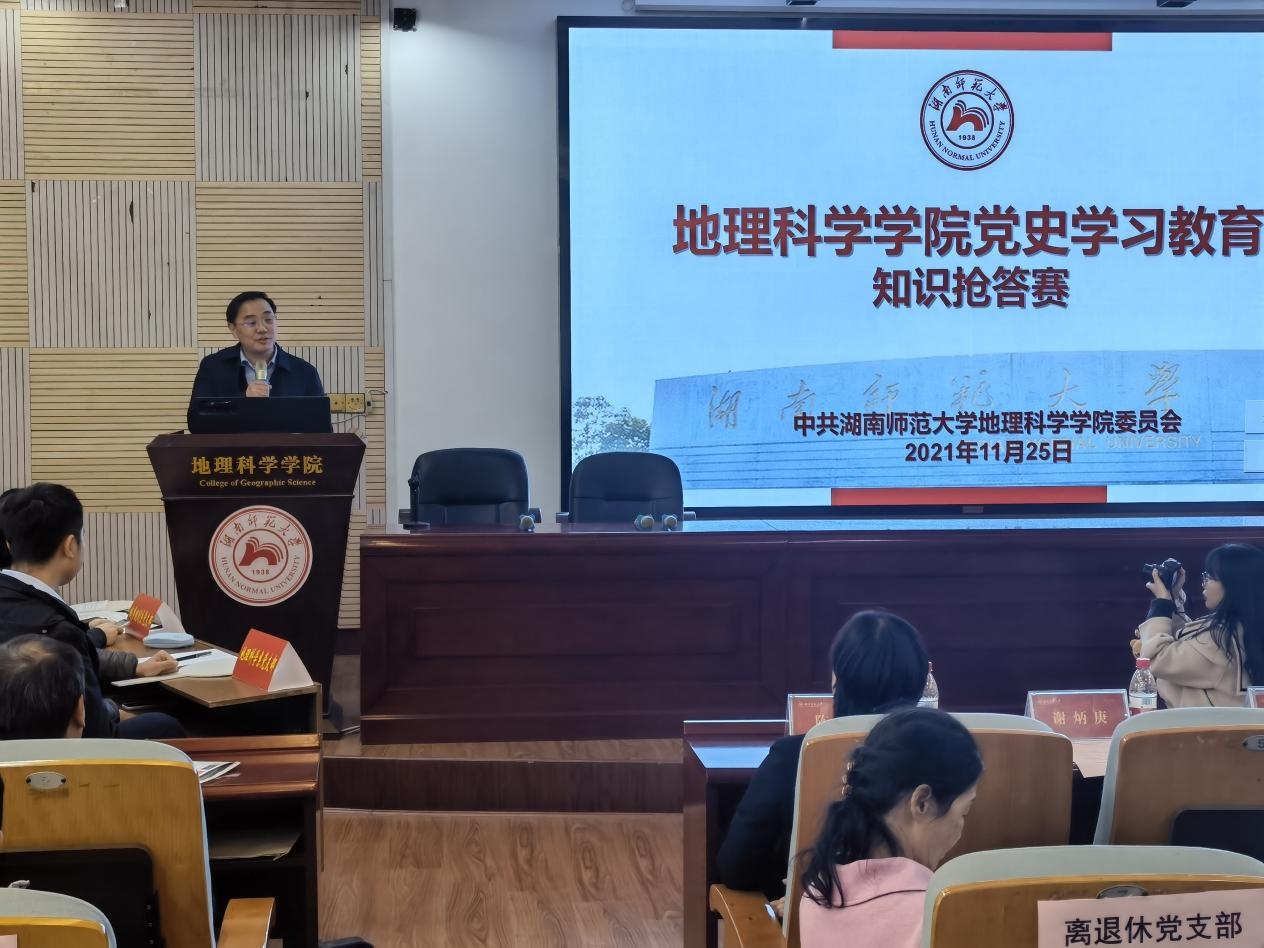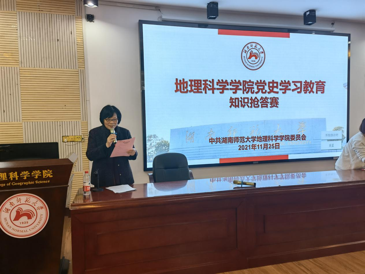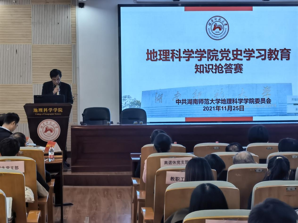 抢答赛由青年教师韩龙飞、王婷主持。主持人介绍了参赛队伍和比赛规则。参加比赛的共计10支代表队,每支队伍由3名党员组成,其中教师代表队5支,分别是地理科学系党支部、城乡规划系党支部、土地科学系党支部、地理信息系党支部和行政党支部;学生代表队5支,分别是研究生自然地理党支部、研究生土地科学党支部、研究生人文地理党支部、研究生学科地信党支部和本科生党支部。抢答赛共设置100道题目,邀请马克思主义学院根据中央组织部编写的著作《中国共产党组织建设一百年》制作题库,试题均为客观题,题型为单选题、多选题、填空题以及判断题;教师党支部和学生党支部分别进行比拼,分别设置奖项;比赛共进行10轮抢答,每轮10题,教师党支部、学生党支部各5轮,交替进行抢答。比赛现场气氛活跃,竞争激烈,赛出了思想与火花,营造出了浓厚的党史学习教育氛围。