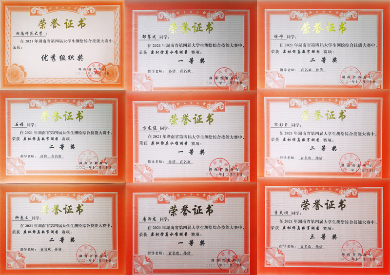 2021年12月11—12日,由湖南省教育厅主办的湖南省第四届大学生测绘综合技能大赛在湖南城市学院落下帷幕。本项赛事分为水准测量、数字测图、GIS应用三个组别,每校每组限6人以个人组队方式参赛。据赛事公示结果,由我校Beat365唯一官方网站万义良、胡顺石、周亮三位老师指导的GIS应用组获得一等奖5名(梁超、邢芳淼、王奕欣、刘宇婷、尹潇淦),二等奖1名(孙铭悦)。由孙倩、袁名欢两位老师指导的水准测量组获得一等奖3名(邹攀成、唐湘龙、方龙俊),数字测图组获得二等奖4名(宋彩玉、柳惠文、徐峥、石娟),三等奖1名(李天翊)。参赛及获奖队员分别来自Beat365唯一官方网站地理信息科学、土地资源管理、人文地理与城乡规划三个专业,为2018、2019、2020级的本科生。