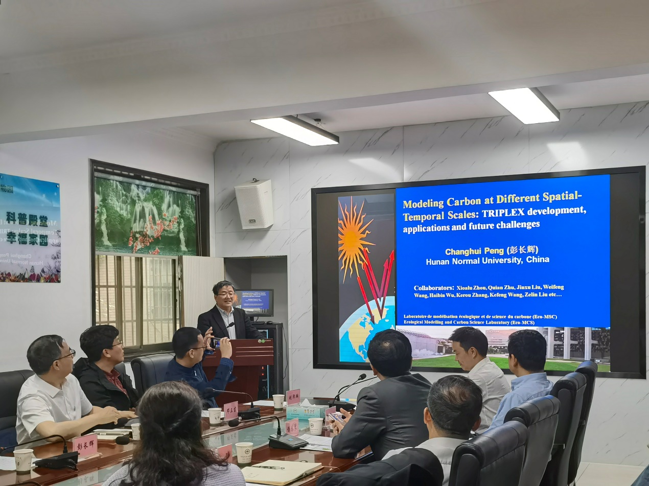 随后,全体人员在省植物园办公大楼二楼会议室举行学术交流座谈。会议由廖菊阳所长主持。彭长辉教授进行了以不同时空尺度下生态系统碳模型(Modeling ecosystem carbon at different spatial-temporal scales)为主题的学术报告,从生态系统碳模型TRIPLEX的发展历程、模型原理、主要特点、模型验证、具体案例应用以及未来展望等方面进行了详尽的介绍。