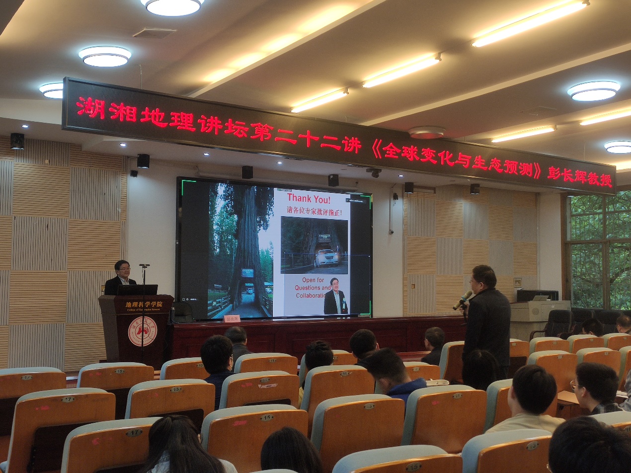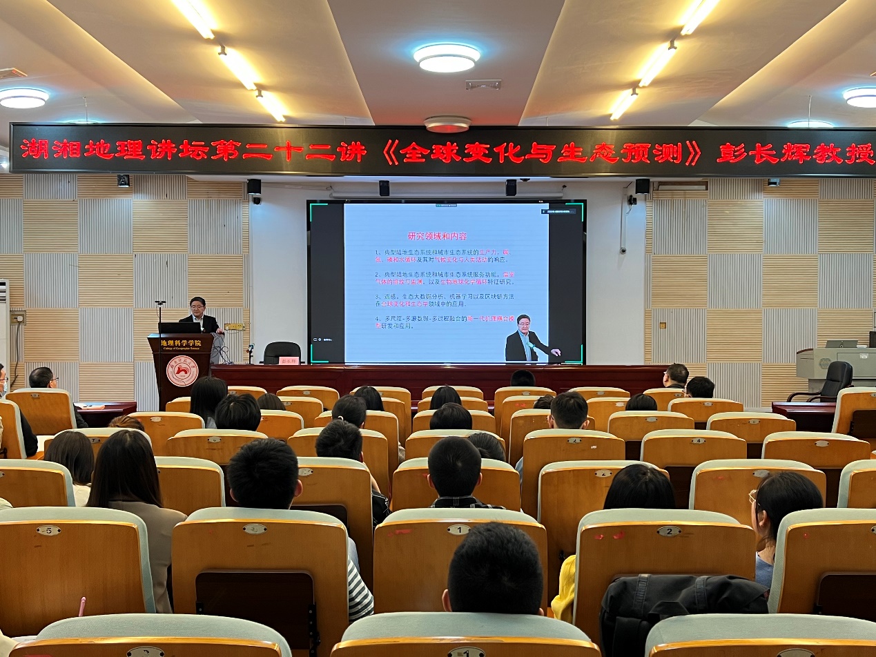 2022年5月19日下午,365官网在经纬楼301报告厅举办湖湘地理讲坛第二十二讲——全球变化与生态预测前沿专题讲座。讲座由湖南师范大学“潇湘学者”特聘教授、魁北克大学终身教授、美国科学促进会会士(AAAS Fellow)彭长辉教授主讲,学院彭渤教授、毛德华教授、饶志国教授、贺新光教授等100余名师生线上或线下参加了讲座。讲座由学院院长周国华教授主持。