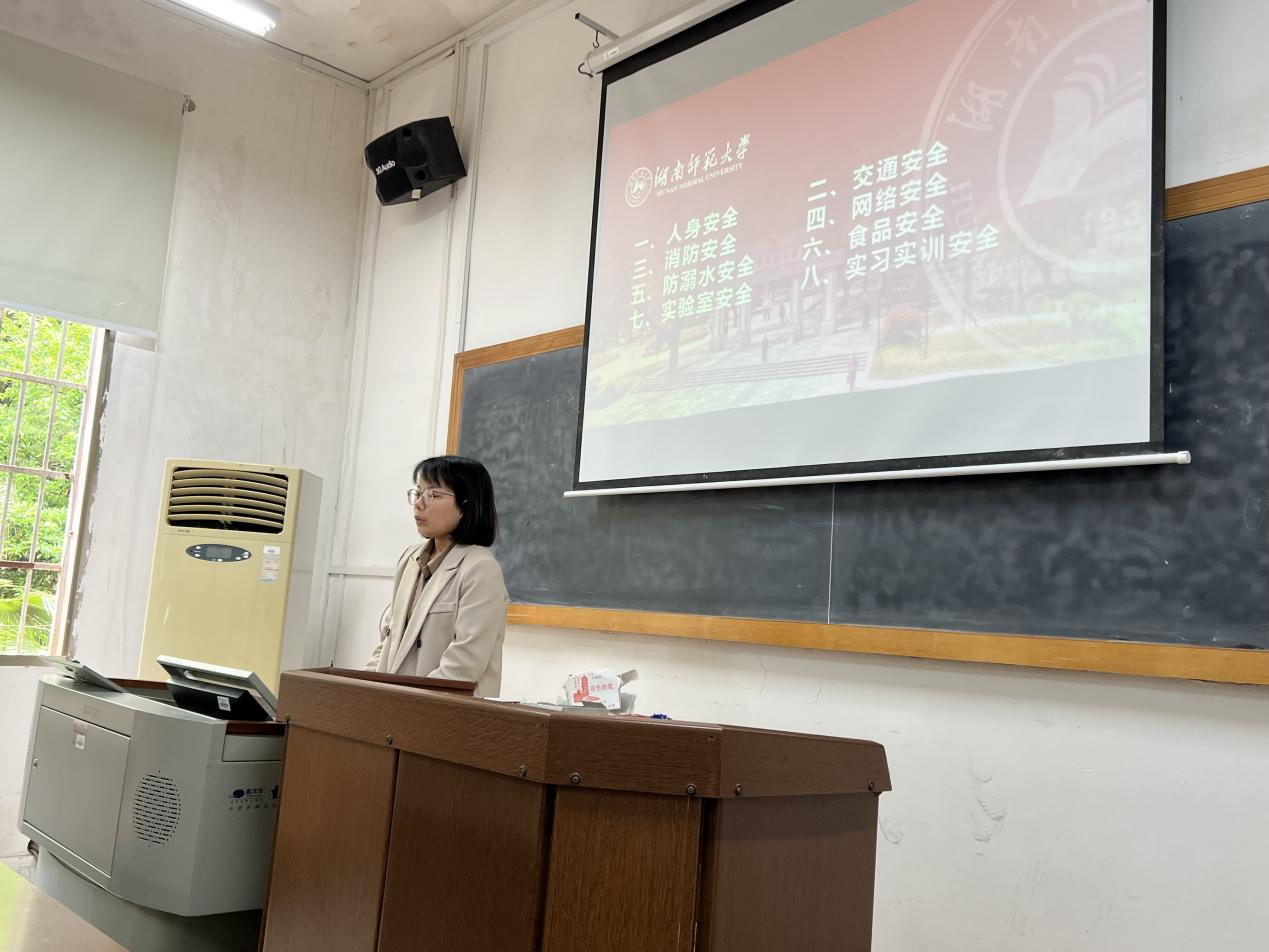 学工办张凤老师进行安全主题教育宣讲,宣讲内容涵盖人身安全、交通安全、消防安全、网络安全、防溺水安全、食品安全、实验室安全、实习实训安全等八个方面。
