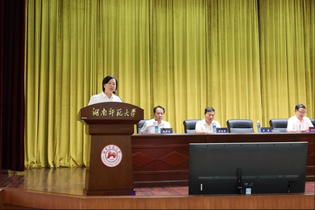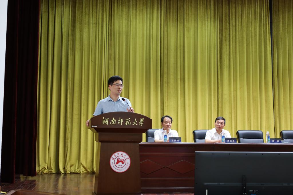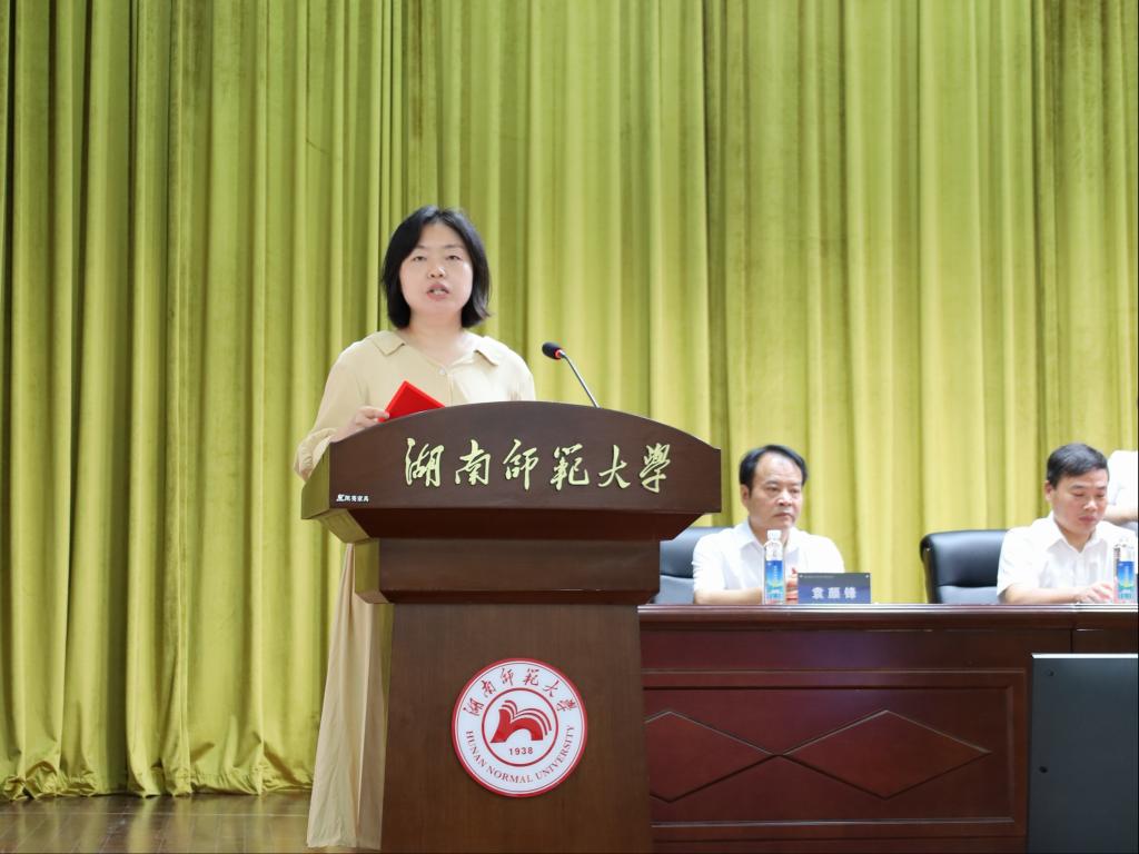 学院博士生导师、湖南省杰出青年基金获得者、湖湘青年英才、湖南省青年骨干教师王欣教授代表教师发言,她提出学生要把个人命运与国家命运紧密结合:一要努力学习,让自己成为地理学领域的专业人才;二要锻炼身体,提高身体素质,终身锻炼;三要扩宽视野增长见识,积极参加社团、学术活动,仁爱友善,心胸开阔,见贤思齐,用奋斗点亮青春,成就人生目标。