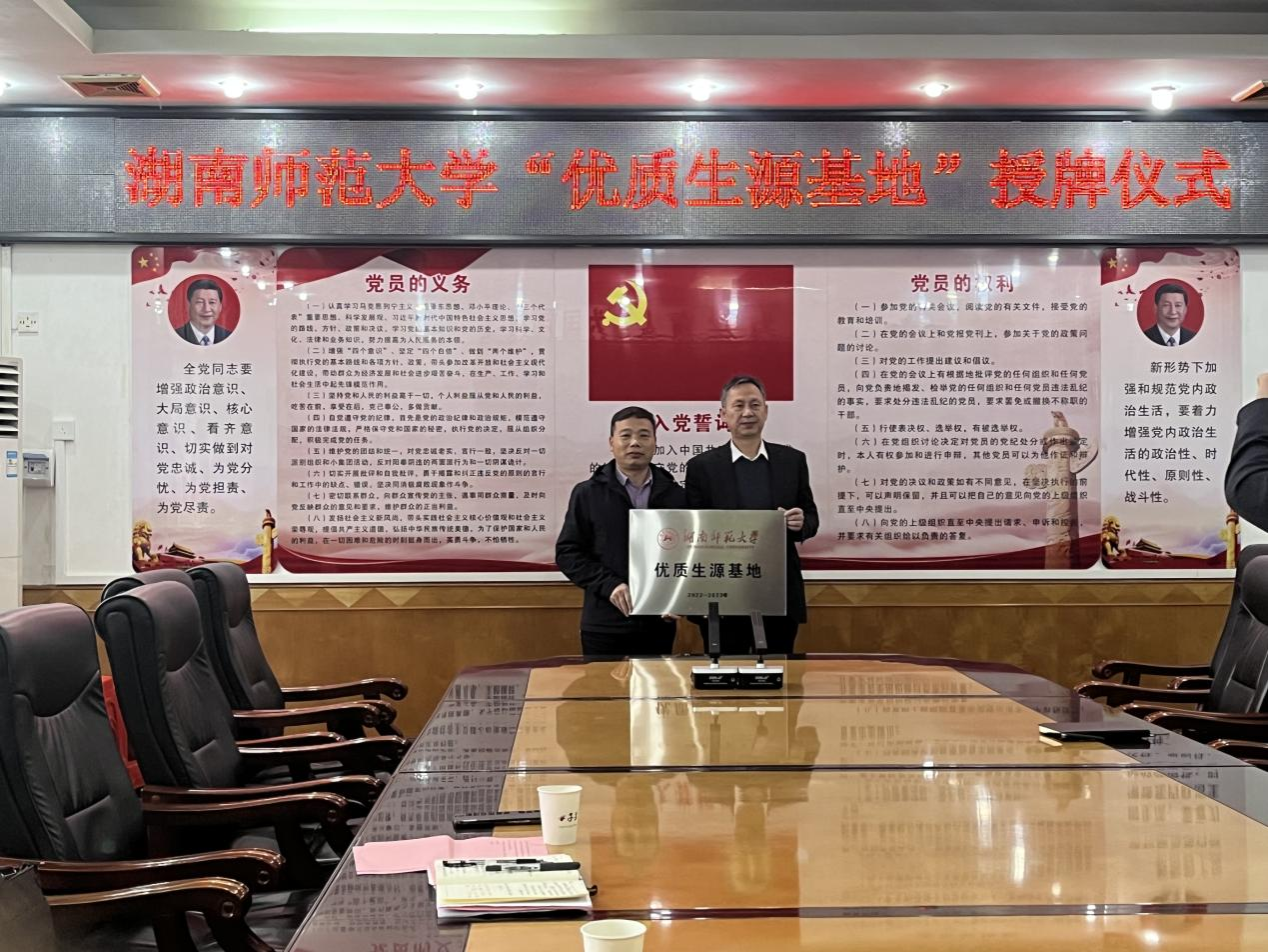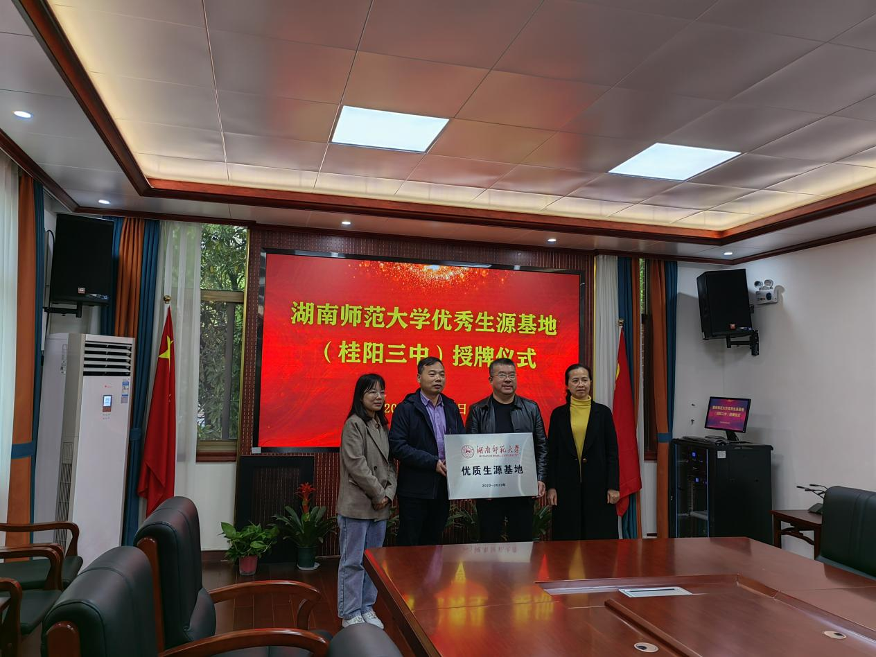 授牌仪式上,Beat365唯一官方网站副院长李忠武简要介绍了湖南师范大学的办学历史、办学规模、学科设置、发展成果,并对郴州市一中、郴州市二中、桂阳县三中在学生培养质量上取得的斐然成绩表示衷心祝贺。希望高校与中学加强交流沟通,搭建高校与中学的工作桥梁、合作平台,持续推进我校本科生招生工作,提高生源中学的品牌化、品质化。郴州市一中党委副书记李民娟、郴州市二中党委书记杨小山、桂阳县三中党委书记何天宝、校长邓小红分别代表学校向李忠武一行的到来表示热烈的欢迎和诚挚的感谢,并介绍了各自学校的基本概况、办学特色、办学成绩等,表示将以此次活动为契机,为师大输送更多优质生源。仪式最后,李忠武代表我校向郴州市一中、郴州市二中、桂阳县三中授予“优质生源基地”牌匾。