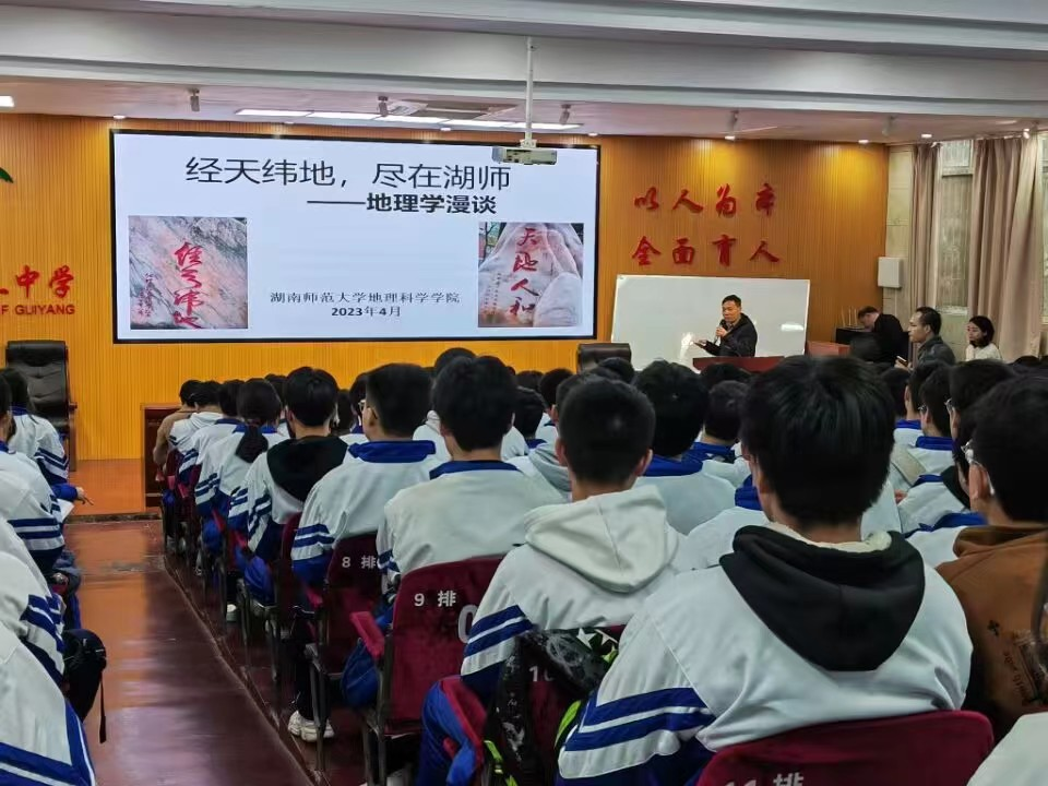 随后,李忠武院长在桂阳县三中为与会全体师生作《地理学漫谈》专题讲座。他从地理科学专业概述、地理科学专业课程及特色以及专业发展前景三个方面展开讲座,结合学科专业特色,用通俗的语言进行深入浅出的阐述,带领同学们了解地理、认识地理、探寻地理,激发他们对地理科学专业的学习兴趣。同时,李忠武还为同学们介绍了我校以及学院的历史沿革、学科建设、人才培养、学术成果等,鼓励同学们报考我校。