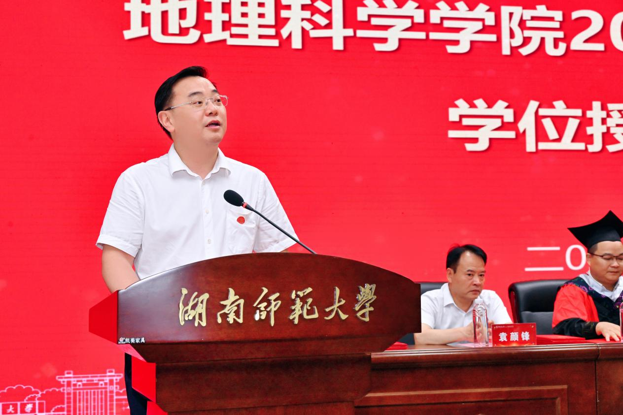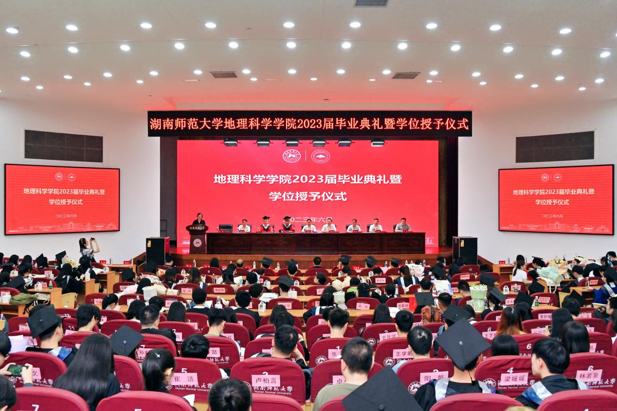 6月16日上午,Beat365唯一官方网站在国际学术报告厅举行2023届毕业生毕业典礼。院长周国华、院党委书记刘忠耿、学校“潇湘学者”特聘专家、博士生导师彭长辉教授、博士生导师谢炳庚教授、教学副院长李忠武、科研副院长饶志国、副处级专职组织员袁颜锋、副院长王磊、土地科学系系主任毛德华教授、地理信息工程系系主任李德平教授、地理科学系系主任邓楚雄教授、城乡规划系系主任朱佩娟教授、博士生导师谭长银教授、地理科学系韩广教授、土地科学系夏卫生教授、城乡规划系贺艳华教授以及2019级班导师、科研办及学工办全体老师出席。