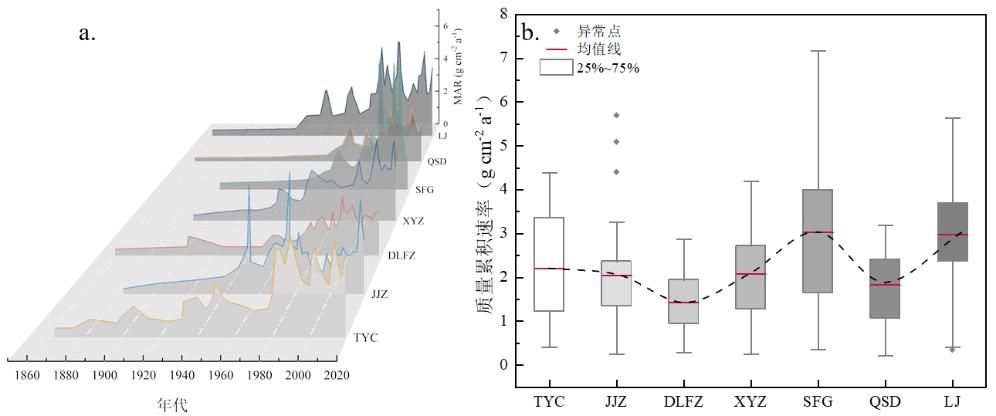 图1 洞庭湖沉积泥沙质量累积速率的时间(a)和空间(b)分布