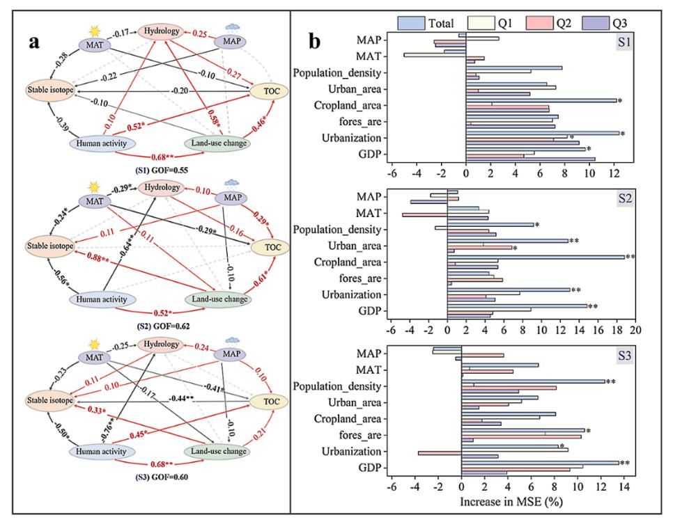 相关研究结果阐明了洞庭湖流域人类活动对湖泊沉积物特征的驱动路径及相对贡献(图4),揭示了人类活动对流域碳流失的影响,强调了区域发展过程中开展人类活动调控的重要作用,为区域生态系统碳循环研究提供了新的认识,也为湖泊湿地可持续发展和生态环境管理提供了科学依据。