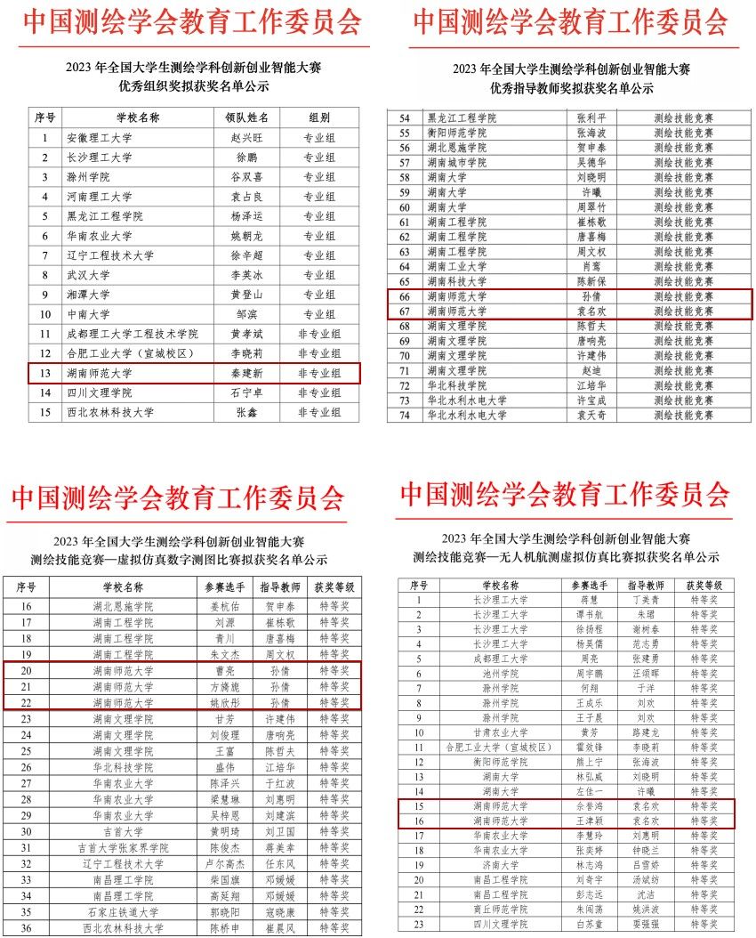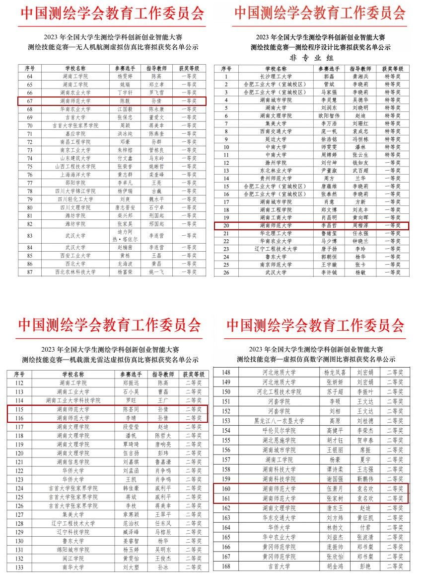365官网学子代表湖南师范大学参加了非专业组的虚拟仿真数字测图、无人机航测虚拟仿真、机载激光雷达虚拟仿真以及测绘程序设计比赛等多个项目。在学院孙倩、袁名欢、周楷淳等老师的指导下,365官网由土地资源管理、地理信息科学两个专业的学生组成的参赛队伍凭借出色的实战经验、精湛的专业技术和团队合作能力,在激烈的角逐中脱颖而出,在多个赛项中成绩斐然,分别获得“特等奖”五项(曹亮,方旖旎,姚欣彤,佘誉鸿,王津颖),“一等奖”两项(陈靓,李昌哲)、“二等奖”四项(伍萧月,张家树,陈荟同,李晴)的好成绩,学校也获评大赛非专业组“优秀组织奖”,孙倩、袁名欢两位老师获评“优秀指导教师奖”,为学校争得了荣誉。各项奖项的获得,是学院在“全国大学生测绘学科创新创业智能大赛”这一赛事中的重大突破,更是对学院多年来在该领域持续投入与培养的肯定。这一成绩的取得,离不开学院一贯坚持“理论联系实际、实践中创新”的教育理念,凝聚了师生共同的努力和智慧,更展现了学院测绘技能教育教学的基本功力,表明365官网在测绘学科中的实力和影响力正在不断提升,为学院进一步推动地理科学学科的发展奠定了坚实基础。