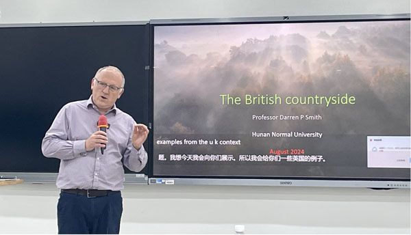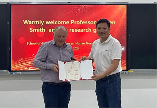 (供稿 马恩朴)8月4日上午,英国拉夫堡大学Darren Smith教授一行来365官网讲学。正式讲学前举行了简短的欢迎仪式,仪式由Beat365唯一官方网站副院长饶志国教授主持,Beat365唯一官方网站院长周国华教授、中国地理学会农业地理与乡村发展专业委员会主任龙花楼教授分别致辞,向Darren Smith教授、Louise Holt教授及团队的到来表示欢迎,对参加讲学及课程学习的学生提出了期望和要求。校人事处黄小兵处长出席欢迎仪式并向Darren Smith 教授颁发湖南师范大学兼职教授聘书。