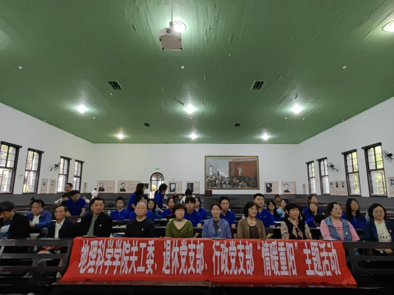 参观结束后,离退休老同志与学院团学组织学生在湖南省立第一师范学校大礼堂开展“情暖重阳”文艺活动。学生们为老教师献上了精心准备的节目,包括朗诵《我的祖国》、合唱《歌唱祖国》、舞蹈《党旗飘扬的方向》等,表达了对祖国的热爱和对老教师们美好的祝愿。