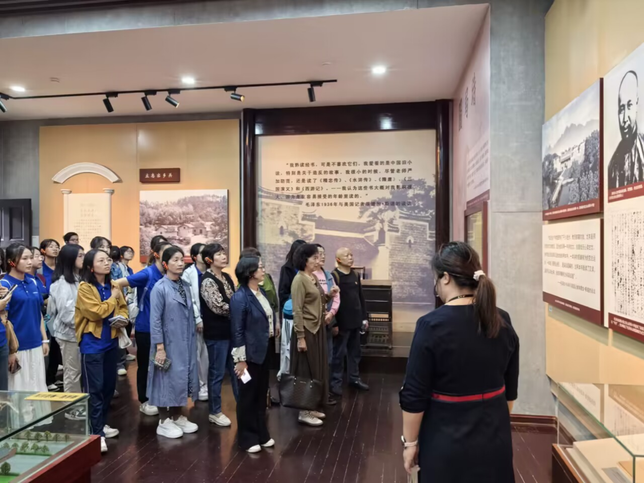 在毛泽东与湖南第一师范学院纪念馆,学院师生一行参观了湖南省立第一师范学校大礼堂、第八班教室、第八班寝室、阅报室、城南古井、附小主事室、工人夜学旧址等14处纪念点,学习了青年毛泽东在湖南省立第一师范学校求学、执教及从事早期革命活动的光辉事迹和革命信仰。