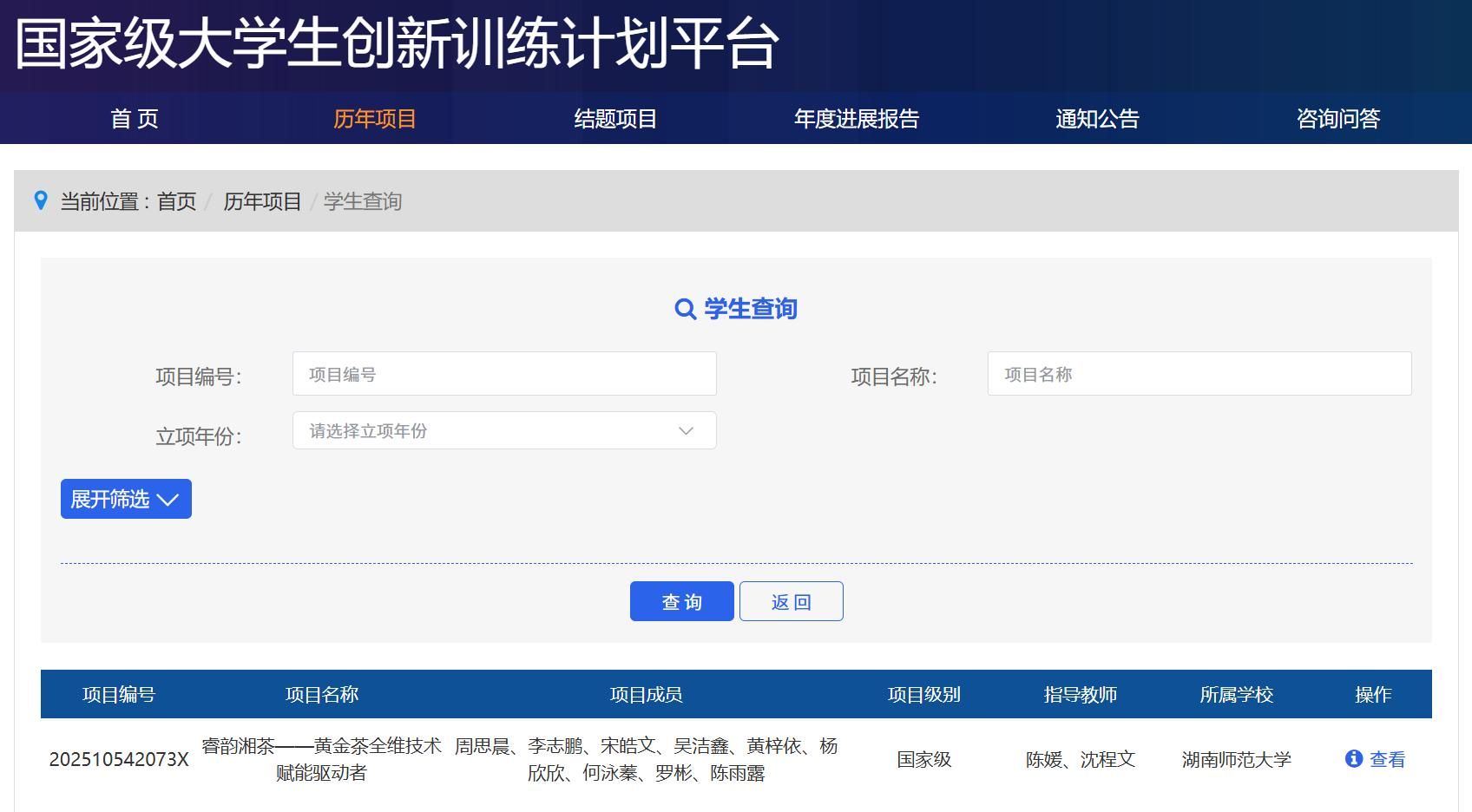 国家级大学生创新训练计划平台项目查询结果