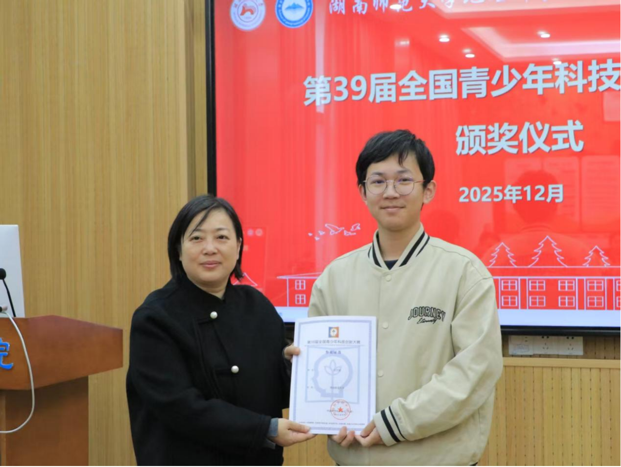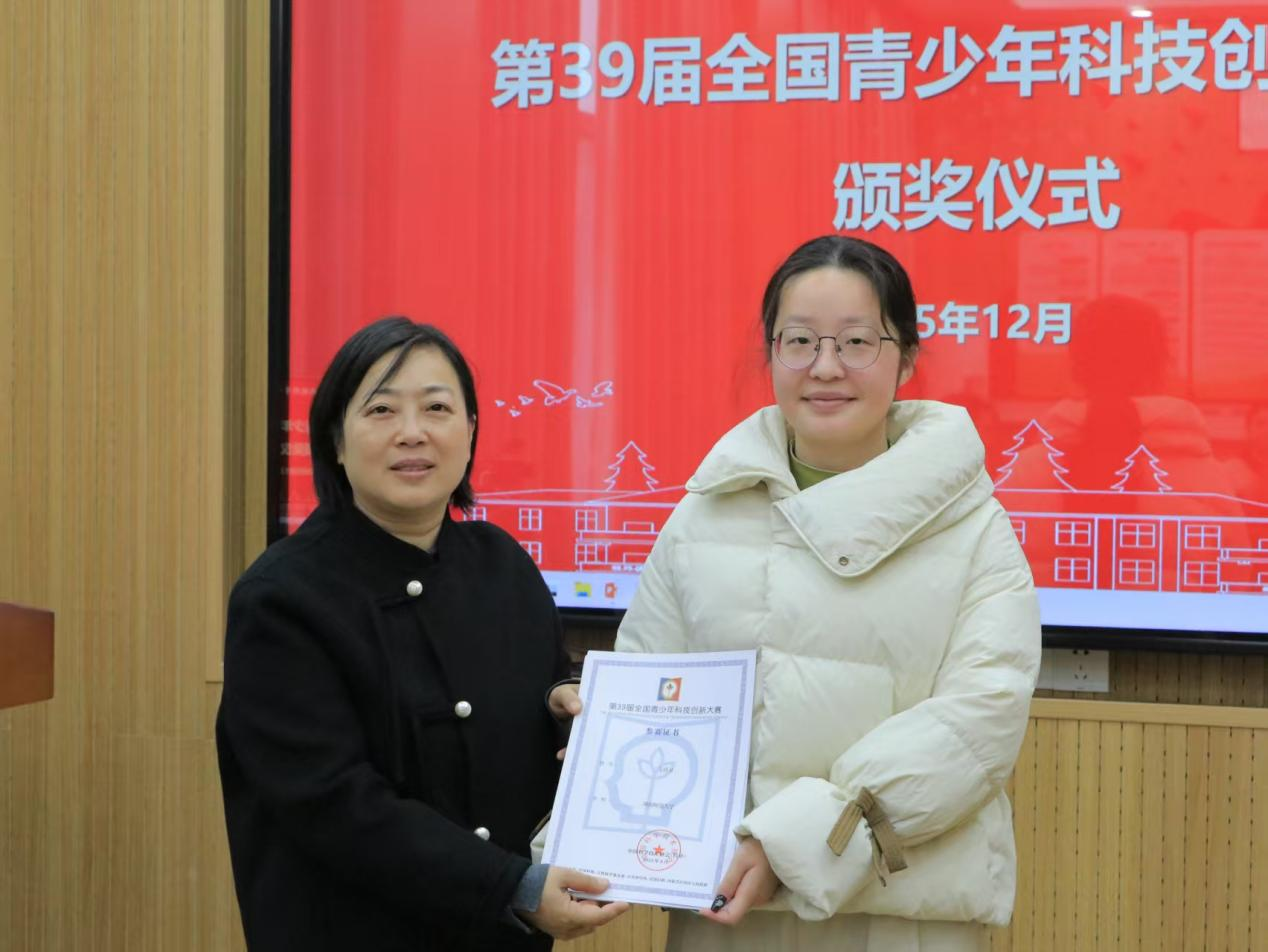 仪式伊始,陈媛首先向获奖的文靖灵、彭浩原两位同学表示祝贺,祝贺两位同学的作品凭借优异表现脱颖而出,在第39届全国青少年科技创新大赛中举得优异成绩。她指出该赛事由中国科技协会、共青团中央、中国地理科学学会等单位联合主办,具有深厚的历史底蕴与高含金量。此次颁奖是受中国地理学会委托为两名学生颁奖,希望借这场简约而庄重的仪式,传递对获奖学子的肯定。随后,陈媛与院学工办老师依次为文靖灵、彭浩原同学颁奖并合影留念,勉励他们再接再厉,再创佳绩。