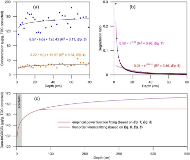 (a)SSP2021泥炭岩芯CLbrGDGTs含量(蓝点)和IPL brGDGTs含量(橙点)随深度的变化;(b)一级动力学模型(红线)和经验幂函数模型(紫线)拟合的降解速率变化;(c)基于一级动力学模型(红线)和经验幂函数模型(紫线)推导的全新世泥炭CLbrGDGTs累计产量