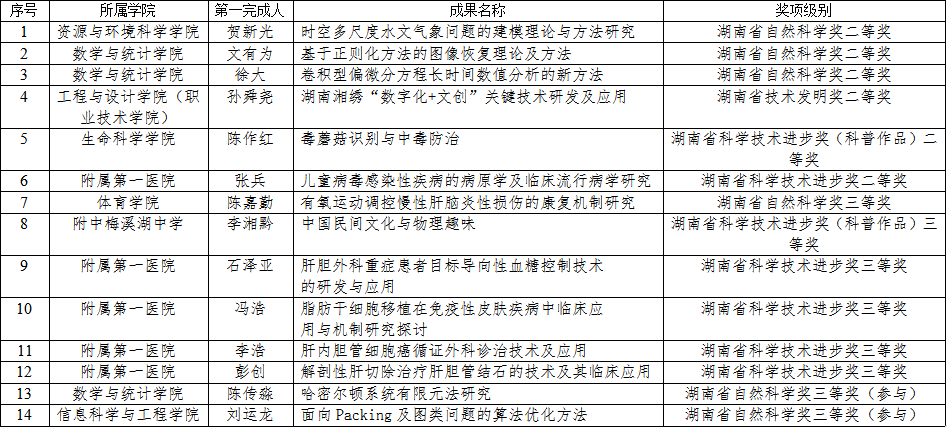 (供稿 科学技术处 资环学院)6月10日上午,湖南省科技创新奖励大会在长沙召开。我校14项研究成果荣获湖南省人民政府表彰,其中包括湖南省自然科学奖二等奖3项、三等奖3项(其中参与2项);湖南省技术发明二等奖1项;湖南省科学技术进步奖二等奖2项,三等奖5项,获奖总数创我校历年新高。365官网贺新光(第一完成人)、章新平、秦建新、吴华武、陶俐芝团队的研究成果《时空多尺度水文气象问题的建模理论与方法研究》荣获湖南省自然科学奖二等奖。