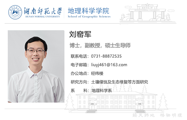 刘窑军:博士,副教授,硕士生导师。2014年博士毕业于华中农业大学,主要从事土壤侵蚀及生态修复等方面研究。主持国家自然科学基金面上项目、青年基金、国家重点研发专项子课题等多项国家级项目,在Journal of Hydrology、Science of the Total Environment、Catena、水科学进展、农业工程学报、土壤学报等国内外主流学术期刊上发表论文20余篇,授权专利4项,参编专著2部。