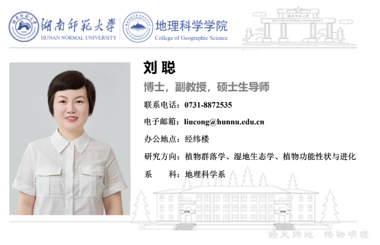 刘聪,女,博士,副教授,硕士生导师。主要研究方向为亚热带植被群落生产力对植物多样性的响应机理,植物功能性状特征在物种进化中的适应策略,共生植物生态位互补与竞争等。在国内外学术期刊Ecosystems,Plant and Soil,Ecological Informatics,Environmental Reviews,Plant Ecology & Diversity,植物生态学报,水土保持学报等发表SCI及核心期刊论文20余篇;主持及参与国家自然基金项目、湖南省自然科学基金项目、国家林业公益性行业科研专项、国家科技部重点野外科学观测站项目等多项科研项目。荣获博士研究生国家奖学金、全日制研究生学术成就奖学金、国家留学基金委公派研究生奖学金、中国林业学术大会优秀论文一等奖、“领跑者5000—中国精品科技期刊顶尖学术论文”等奖励。
